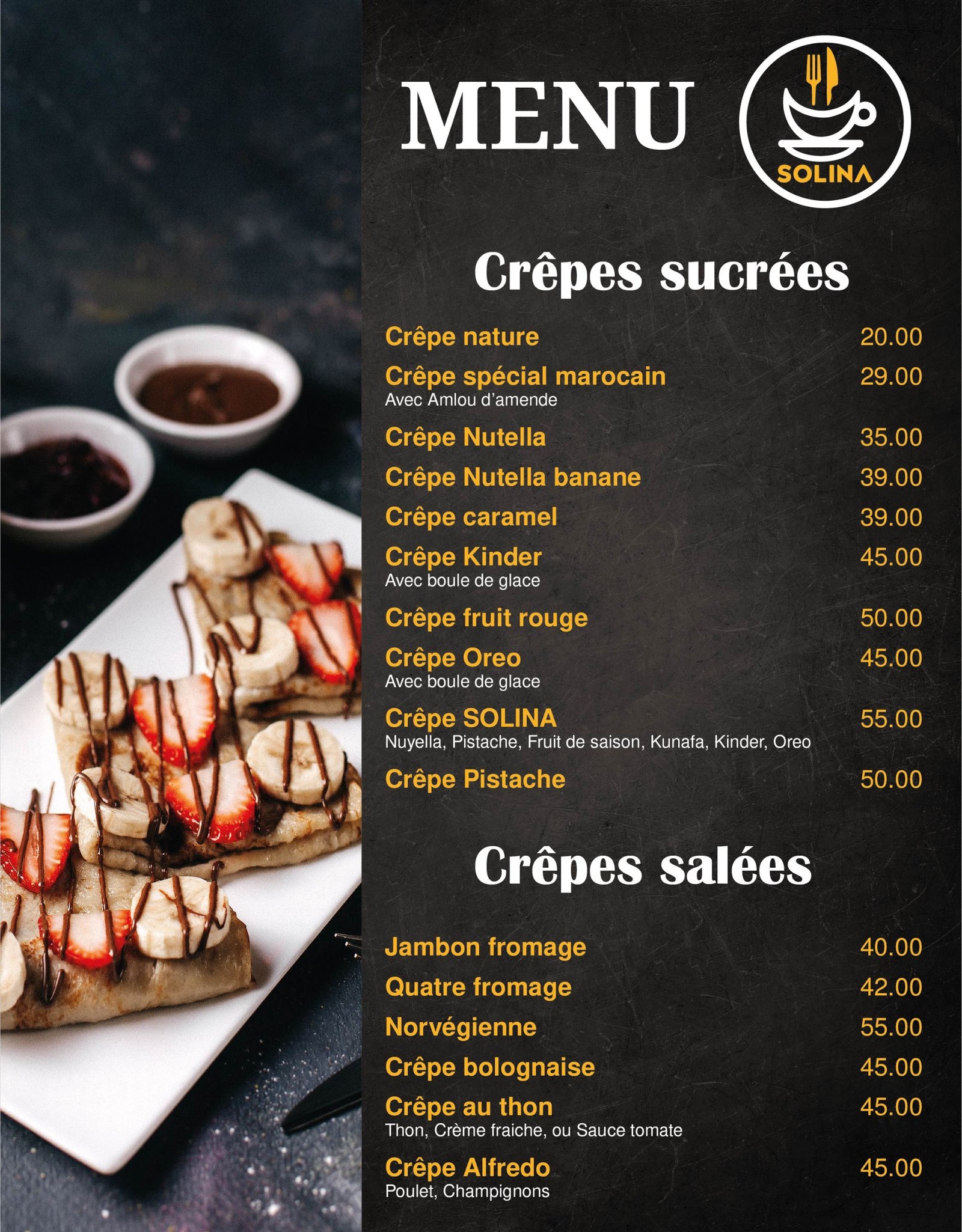 Solina est l’adresse idéale. Spécialisé dans les grillades, les plats variés, les crêpes, les pizzas et des options inspirées des goûts marocains, notre établissement vous garantit un moment gourmand inoubliable.
